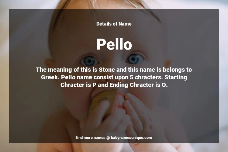 The name Pello is chosen by those who are willing to find Unique Boy Baby Names. The meaning of this is Stone and this name is belongs to Greek Origin. Baby Name Pello consist upon 5 chracters. Starting alphabet is P and ending alphabet is O. This name is used primarily by parents who are considering unique baby names for Boy. The Zodiac Sign suitbale for this name are;