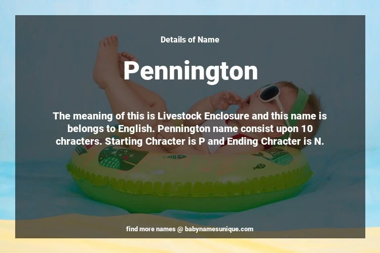 The name Pennington is chosen by those who are willing to find Unique Transgenders Baby Names. The meaning of this is Livestock Enclosure and this name is belongs to English Origin. Baby Name Pennington consist upon 10 chracters. Starting alphabet is P and ending alphabet is N. This name is used primarily by parents who are considering unique baby names for Transgenders. The Zodiac Sign suitbale for this name are;