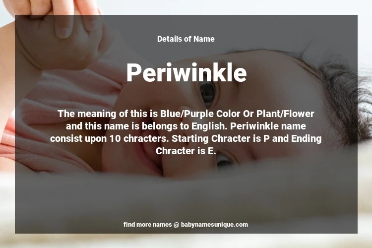 The name Periwinkle is chosen by those who are willing to find Unique Transgenders Baby Names. The meaning of this is Blue/Purple Color Or Plant/Flower and this name is belongs to English Origin. Baby Name Periwinkle consist upon 10 chracters. Starting alphabet is P and ending alphabet is E. This name is used primarily by parents who are considering unique baby names for Transgenders. The Zodiac Sign suitbale for this name are;