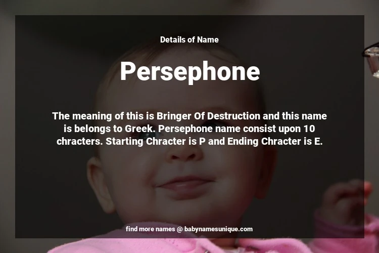 The name Persephone is chosen by those who are willing to find Unique Transgenders Baby Names. The meaning of this is Bringer Of Destruction and this name is belongs to Greek Origin. Baby Name Persephone consist upon 10 chracters. Starting alphabet is P and ending alphabet is E. This name is used primarily by parents who are considering unique baby names for Transgenders. The Zodiac Sign suitbale for this name are;