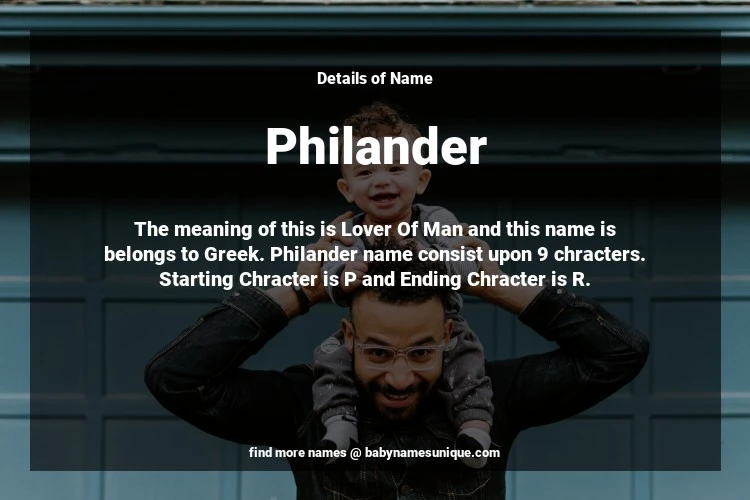 The name Philander is chosen by those who are willing to find Unique Boy Baby Names. The meaning of this is Lover Of Man and this name is belongs to Greek Origin. Baby Name Philander consist upon 9 chracters. Starting alphabet is P and ending alphabet is R. This name is used primarily by parents who are considering unique baby names for Boy. The Zodiac Sign suitbale for this name are;