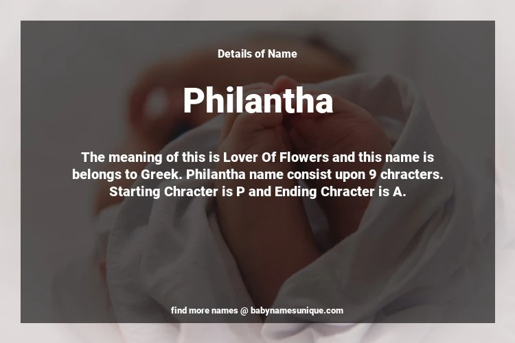 The name Philantha is chosen by those who are willing to find Unique Transgenders Baby Names. The meaning of this is Lover Of Flowers and this name is belongs to Greek Origin. Baby Name Philantha consist upon 9 chracters. Starting alphabet is P and ending alphabet is A. This name is used primarily by parents who are considering unique baby names for Transgenders. The Zodiac Sign suitbale for this name are;