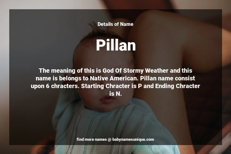The name Pillan is chosen by those who are willing to find Unique Transgenders Baby Names. The meaning of this is God Of Stormy Weather and this name is belongs to Native American Origin. Baby Name Pillan consist upon 6 chracters. Starting alphabet is P and ending alphabet is N. This name is used primarily by parents who are considering unique baby names for Transgenders. The Zodiac Sign suitbale for this name are;
