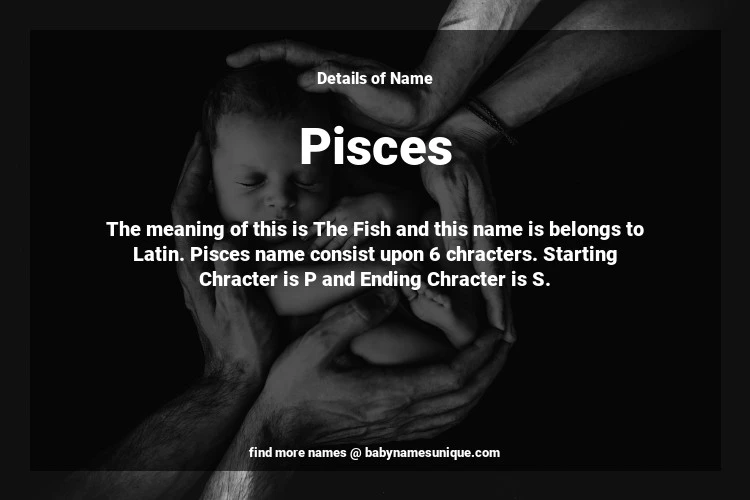 The name Pisces is chosen by those who are willing to find Unique Transgenders Baby Names. The meaning of this is The Fish and this name is belongs to Latin Origin. Baby Name Pisces consist upon 6 chracters. Starting alphabet is P and ending alphabet is S. This name is used primarily by parents who are considering unique baby names for Transgenders. The Zodiac Sign suitbale for this name are;