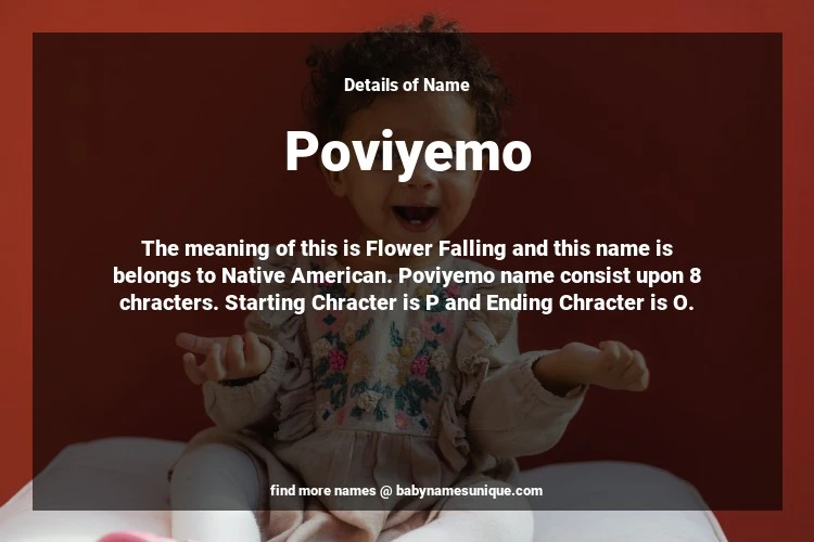 The name Poviyemo is chosen by those who are willing to find Unique Transgenders Baby Names. The meaning of this is Flower Falling and this name is belongs to Native American Origin. Baby Name Poviyemo consist upon 8 chracters. Starting alphabet is P and ending alphabet is O. This name is used primarily by parents who are considering unique baby names for Transgenders. The Zodiac Sign suitbale for this name are;