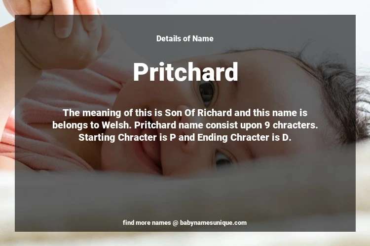 The name Pritchard is chosen by those who are willing to find Unique Boy Baby Names. The meaning of this is Son Of Richard and this name is belongs to Welsh Origin. Baby Name Pritchard consist upon 9 chracters. Starting alphabet is P and ending alphabet is D. This name is used primarily by parents who are considering unique baby names for Boy. The Zodiac Sign suitbale for this name are;