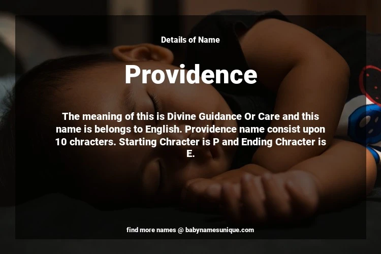 The name Providence is chosen by those who are willing to find Unique Transgenders Baby Names. The meaning of this is Divine Guidance Or Care and this name is belongs to English Origin. Baby Name Providence consist upon 10 chracters. Starting alphabet is P and ending alphabet is E. This name is used primarily by parents who are considering unique baby names for Transgenders. The Zodiac Sign suitbale for this name are;