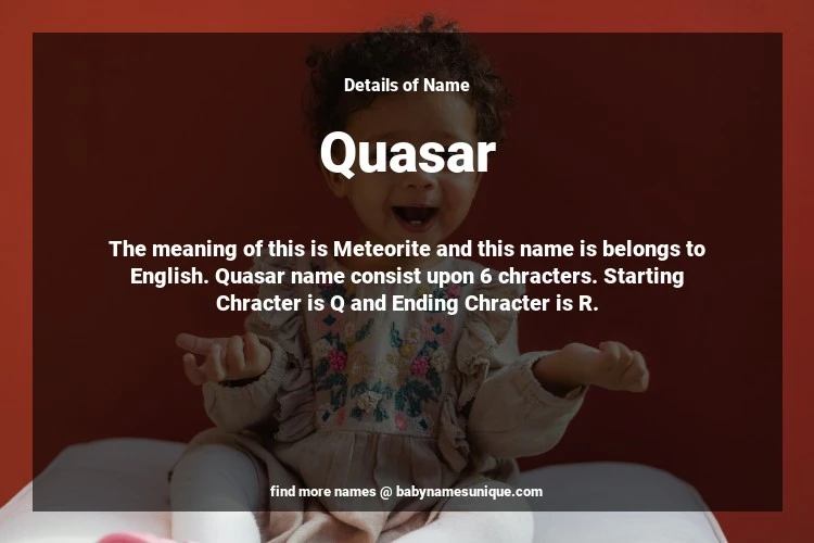 The name Quasar is chosen by those who are willing to find Unique Transgenders Baby Names. The meaning of this is Meteorite and this name is belongs to English Origin. Baby Name Quasar consist upon 6 chracters. Starting alphabet is Q and ending alphabet is R. This name is used primarily by parents who are considering unique baby names for Transgenders. The Zodiac Sign suitbale for this name are;
