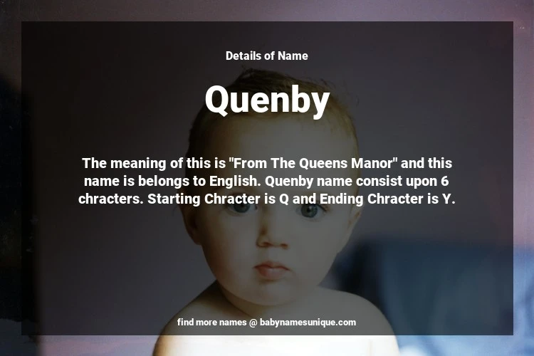 The name Quenby is chosen by those who are willing to find Unique Boy Baby Names. The meaning of this is "From The Queens Manor" and this name is belongs to English Origin. Baby Name Quenby consist upon 6 chracters. Starting alphabet is Q and ending alphabet is Y. This name is used primarily by parents who are considering unique baby names for Boy. The Zodiac Sign suitbale for this name are;