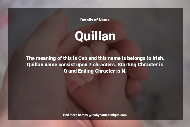 The name Quillan is chosen by those who are willing to find Unique Transgenders Baby Names. The meaning of this is Cub and this name is belongs to Irish Origin. Baby Name Quillan consist upon 7 chracters. Starting alphabet is Q and ending alphabet is N. This name is used primarily by parents who are considering unique baby names for Transgenders. The Zodiac Sign suitbale for this name are;