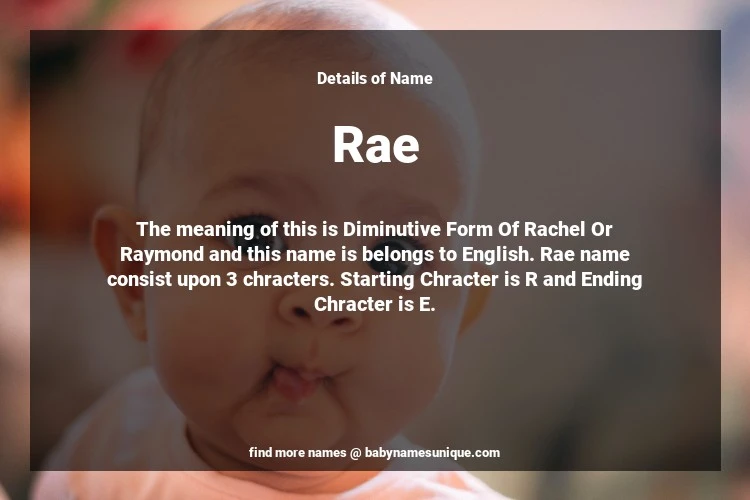 The name Rae is chosen by those who are willing to find Unique Transgenders Baby Names. The meaning of this is Diminutive Form Of Rachel Or Raymond and this name is belongs to English Origin. Baby Name Rae consist upon 3 chracters. Starting alphabet is R and ending alphabet is E. This name is used primarily by parents who are considering unique baby names for Transgenders. The Zodiac Sign suitbale for this name are;