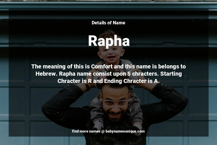 The name Rapha is chosen by those who are willing to find Unique Boy Baby Names. The meaning of this is Comfort and this name is belongs to Hebrew Origin. Baby Name Rapha consist upon 5 chracters. Starting alphabet is R and ending alphabet is A. This name is used primarily by parents who are considering unique baby names for Boy. The Zodiac Sign suitbale for this name are;