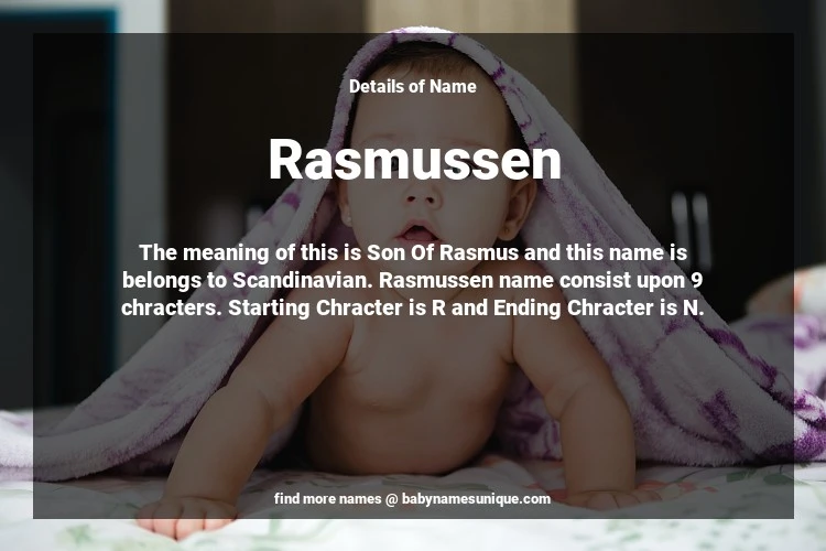 The name Rasmussen is chosen by those who are willing to find Unique Boy Baby Names. The meaning of this is Son Of Rasmus and this name is belongs to Scandinavian Origin. Baby Name Rasmussen consist upon 9 chracters. Starting alphabet is R and ending alphabet is N. This name is used primarily by parents who are considering unique baby names for Boy. The Zodiac Sign suitbale for this name are;