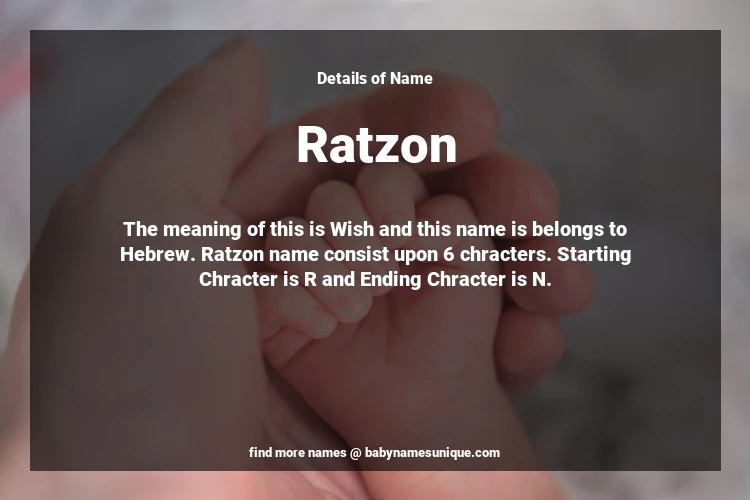 The name Ratzon is chosen by those who are willing to find Unique Boy Baby Names. The meaning of this is Wish and this name is belongs to Hebrew Origin. Baby Name Ratzon consist upon 6 chracters. Starting alphabet is R and ending alphabet is N. This name is used primarily by parents who are considering unique baby names for Boy. The Zodiac Sign suitbale for this name are;