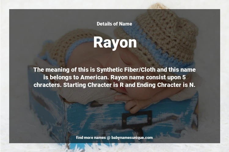 The name Rayon is chosen by those who are willing to find Unique Transgenders Baby Names. The meaning of this is Synthetic Fiber/Cloth and this name is belongs to American Origin. Baby Name Rayon consist upon 5 chracters. Starting alphabet is R and ending alphabet is N. This name is used primarily by parents who are considering unique baby names for Transgenders. The Zodiac Sign suitbale for this name are;