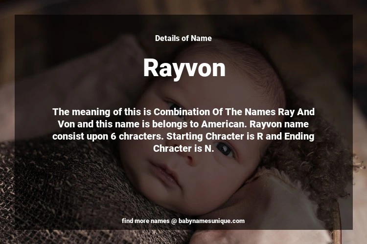 The name Rayvon is chosen by those who are willing to find Unique Boy Baby Names. The meaning of this is Combination Of The Names Ray And Von and this name is belongs to American Origin. Baby Name Rayvon consist upon 6 chracters. Starting alphabet is R and ending alphabet is N. This name is used primarily by parents who are considering unique baby names for Boy. The Zodiac Sign suitbale for this name are;