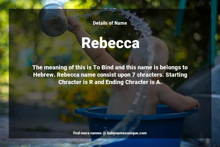 The name Rebecca is chosen by those who are willing to find Unique Transgenders Baby Names. The meaning of this is To Bind and this name is belongs to Hebrew Origin. Baby Name Rebecca consist upon 7 chracters. Starting alphabet is R and ending alphabet is A. This name is used primarily by parents who are considering unique baby names for Transgenders. The Zodiac Sign suitbale for this name are;