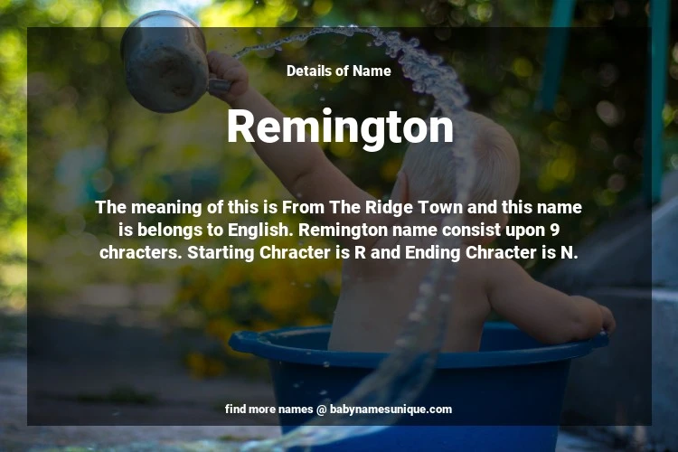 The name Remington is chosen by those who are willing to find Unique Boy Baby Names. The meaning of this is From The Ridge Town and this name is belongs to English Origin. Baby Name Remington consist upon 9 chracters. Starting alphabet is R and ending alphabet is N. This name is used primarily by parents who are considering unique baby names for Boy. The Zodiac Sign suitbale for this name are;