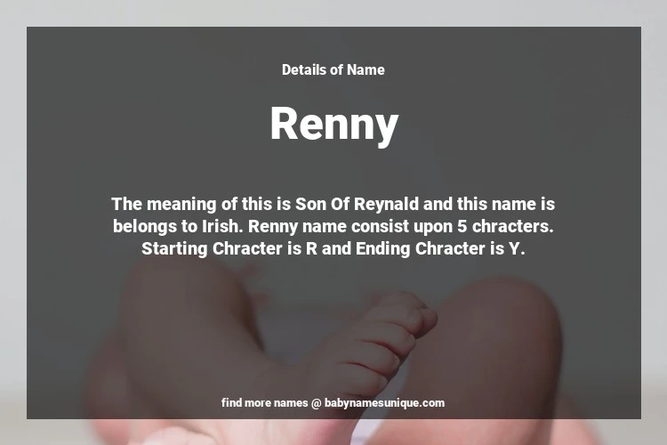 The name Renny is chosen by those who are willing to find Unique Transgenders Baby Names. The meaning of this is Son Of Reynald and this name is belongs to Irish Origin. Baby Name Renny consist upon 5 chracters. Starting alphabet is R and ending alphabet is Y. This name is used primarily by parents who are considering unique baby names for Transgenders. The Zodiac Sign suitbale for this name are;