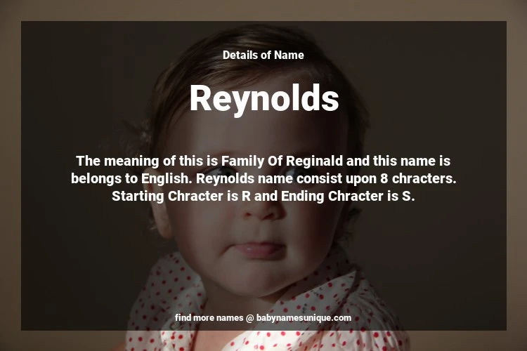 The name Reynolds is chosen by those who are willing to find Unique Boy Baby Names. The meaning of this is Family Of Reginald and this name is belongs to English Origin. Baby Name Reynolds consist upon 8 chracters. Starting alphabet is R and ending alphabet is S. This name is used primarily by parents who are considering unique baby names for Boy. The Zodiac Sign suitbale for this name are;