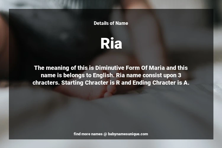 The name Ria is chosen by those who are willing to find Unique Transgenders Baby Names. The meaning of this is Diminutive Form Of Maria and this name is belongs to English Origin. Baby Name Ria consist upon 3 chracters. Starting alphabet is R and ending alphabet is A. This name is used primarily by parents who are considering unique baby names for Transgenders. The Zodiac Sign suitbale for this name are;