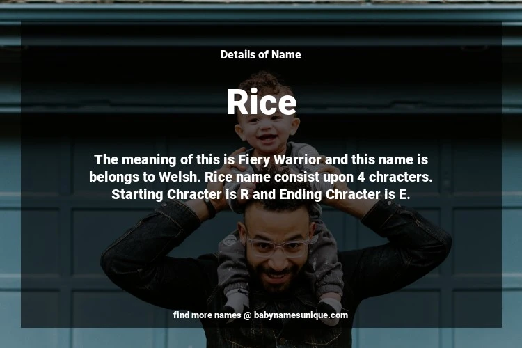 The name Rice is chosen by those who are willing to find Unique Transgenders Baby Names. The meaning of this is Fiery Warrior and this name is belongs to Welsh Origin. Baby Name Rice consist upon 4 chracters. Starting alphabet is R and ending alphabet is E. This name is used primarily by parents who are considering unique baby names for Transgenders. The Zodiac Sign suitbale for this name are;
