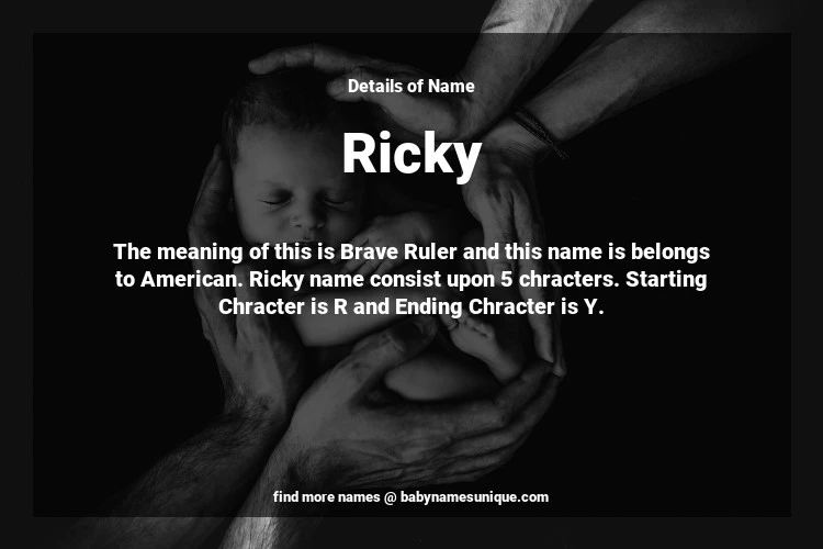 The name Ricky is chosen by those who are willing to find Unique Transgenders Baby Names. The meaning of this is Brave Ruler and this name is belongs to American Origin. Baby Name Ricky consist upon 5 chracters. Starting alphabet is R and ending alphabet is Y. This name is used primarily by parents who are considering unique baby names for Transgenders. The Zodiac Sign suitbale for this name are;