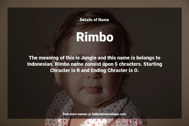 The name Rimbo is chosen by those who are willing to find Unique Boy Baby Names. The meaning of this is Jungle and this name is belongs to Indonesian Origin. Baby Name Rimbo consist upon 5 chracters. Starting alphabet is R and ending alphabet is O. This name is used primarily by parents who are considering unique baby names for Boy. The Zodiac Sign suitbale for this name are;