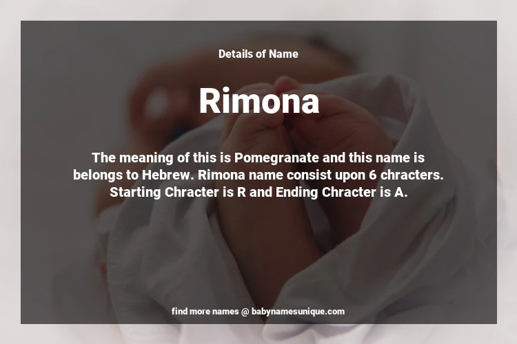 The name Rimona is chosen by those who are willing to find Unique Transgenders Baby Names. The meaning of this is Pomegranate and this name is belongs to Hebrew Origin. Baby Name Rimona consist upon 6 chracters. Starting alphabet is R and ending alphabet is A. This name is used primarily by parents who are considering unique baby names for Transgenders. The Zodiac Sign suitbale for this name are;