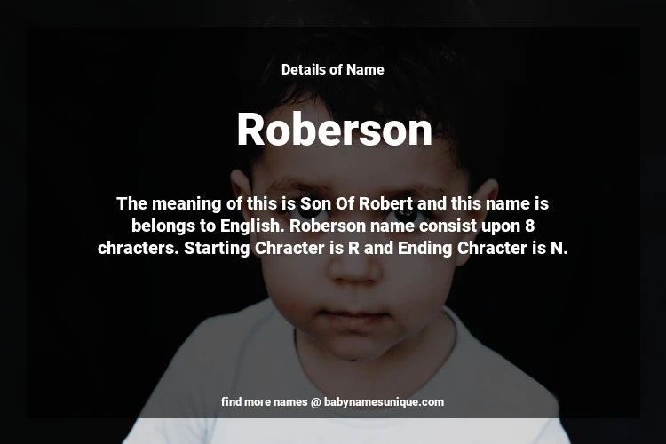 The name Roberson is chosen by those who are willing to find Unique Boy Baby Names. The meaning of this is Son Of Robert and this name is belongs to English Origin. Baby Name Roberson consist upon 8 chracters. Starting alphabet is R and ending alphabet is N. This name is used primarily by parents who are considering unique baby names for Boy. The Zodiac Sign suitbale for this name are;