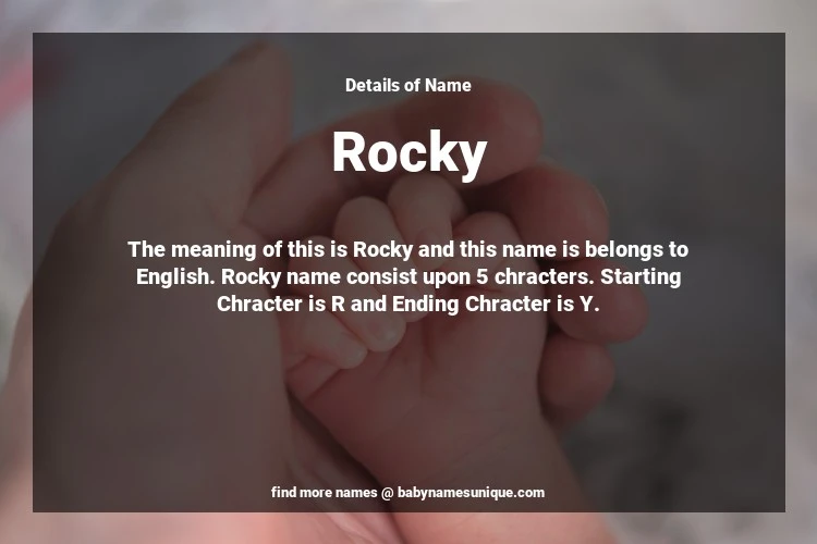 The name Rocky is chosen by those who are willing to find Unique Boy Baby Names. The meaning of this is Rocky and this name is belongs to English Origin. Baby Name Rocky consist upon 5 chracters. Starting alphabet is R and ending alphabet is Y. This name is used primarily by parents who are considering unique baby names for Boy. The Zodiac Sign suitbale for this name are;