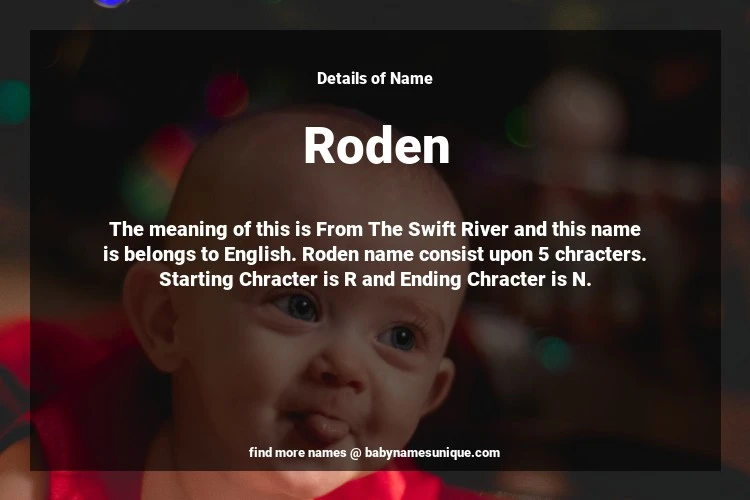 The name Roden is chosen by those who are willing to find Unique Boy Baby Names. The meaning of this is From The Swift River and this name is belongs to English Origin. Baby Name Roden consist upon 5 chracters. Starting alphabet is R and ending alphabet is N. This name is used primarily by parents who are considering unique baby names for Boy. The Zodiac Sign suitbale for this name are;