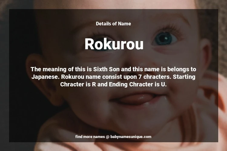 The name Rokurou is chosen by those who are willing to find Unique Boy Baby Names. The meaning of this is Sixth Son and this name is belongs to Japanese Origin. Baby Name Rokurou consist upon 7 chracters. Starting alphabet is R and ending alphabet is U. This name is used primarily by parents who are considering unique baby names for Boy. The Zodiac Sign suitbale for this name are;