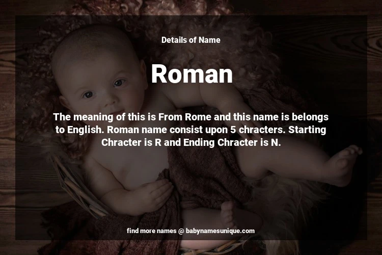 The name Roman is chosen by those who are willing to find Unique Boy Baby Names. The meaning of this is From Rome and this name is belongs to English Origin. Baby Name Roman consist upon 5 chracters. Starting alphabet is R and ending alphabet is N. This name is used primarily by parents who are considering unique baby names for Boy. The Zodiac Sign suitbale for this name are;