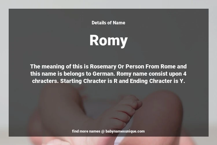 The name Romy is chosen by those who are willing to find Unique Transgenders Baby Names. The meaning of this is Rosemary Or Person From Rome and this name is belongs to German Origin. Baby Name Romy consist upon 4 chracters. Starting alphabet is R and ending alphabet is Y. This name is used primarily by parents who are considering unique baby names for Transgenders. The Zodiac Sign suitbale for this name are;