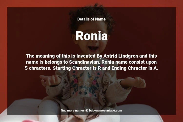 The name Ronia is chosen by those who are willing to find Unique Transgenders Baby Names. The meaning of this is Invented By Astrid Lindgren and this name is belongs to Scandinavian Origin. Baby Name Ronia consist upon 5 chracters. Starting alphabet is R and ending alphabet is A. This name is used primarily by parents who are considering unique baby names for Transgenders. The Zodiac Sign suitbale for this name are;