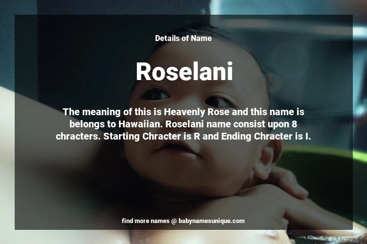 The name Roselani is chosen by those who are willing to find Unique Transgenders Baby Names. The meaning of this is Heavenly Rose and this name is belongs to Hawaiian Origin. Baby Name Roselani consist upon 8 chracters. Starting alphabet is R and ending alphabet is I. This name is used primarily by parents who are considering unique baby names for Transgenders. The Zodiac Sign suitbale for this name are;