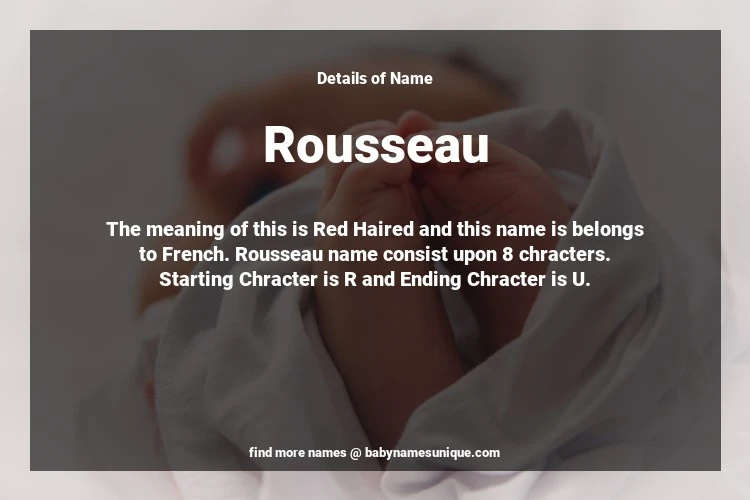 The name Rousseau is chosen by those who are willing to find Unique Transgenders Baby Names. The meaning of this is Red Haired and this name is belongs to French Origin. Baby Name Rousseau consist upon 8 chracters. Starting alphabet is R and ending alphabet is U. This name is used primarily by parents who are considering unique baby names for Transgenders. The Zodiac Sign suitbale for this name are;