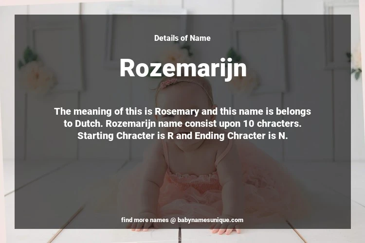 The name Rozemarijn is chosen by those who are willing to find Unique Transgenders Baby Names. The meaning of this is Rosemary and this name is belongs to Dutch Origin. Baby Name Rozemarijn consist upon 10 chracters. Starting alphabet is R and ending alphabet is N. This name is used primarily by parents who are considering unique baby names for Transgenders. The Zodiac Sign suitbale for this name are;