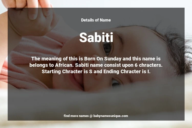 The name Sabiti is chosen by those who are willing to find Unique Boy Baby Names. The meaning of this is Born On Sunday and this name is belongs to African Origin. Baby Name Sabiti consist upon 6 chracters. Starting alphabet is S and ending alphabet is I. This name is used primarily by parents who are considering unique baby names for Boy. The Zodiac Sign suitbale for this name are;