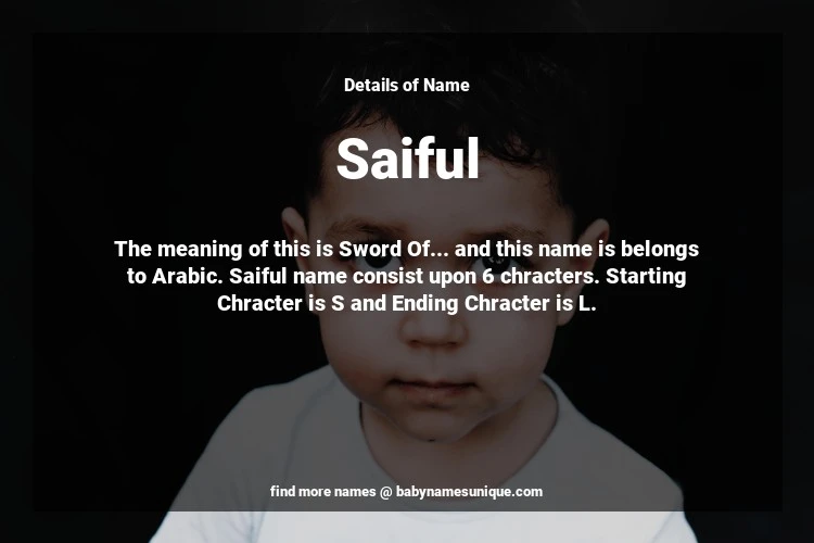The name Saiful is chosen by those who are willing to find Unique Boy Baby Names. The meaning of this is Sword Of... and this name is belongs to Arabic Origin. Baby Name Saiful consist upon 6 chracters. Starting alphabet is S and ending alphabet is L. This name is used primarily by parents who are considering unique baby names for Boy. The Zodiac Sign suitbale for this name are;