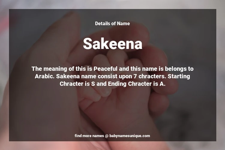 The name Sakeena is chosen by those who are willing to find Unique Transgenders Baby Names. The meaning of this is Peaceful and this name is belongs to Arabic Origin. Baby Name Sakeena consist upon 7 chracters. Starting alphabet is S and ending alphabet is A. This name is used primarily by parents who are considering unique baby names for Transgenders. The Zodiac Sign suitbale for this name are;
