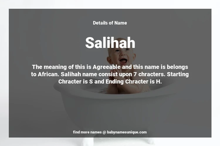 The name Salihah is chosen by those who are willing to find Unique Transgenders Baby Names. The meaning of this is Agreeable and this name is belongs to African Origin. Baby Name Salihah consist upon 7 chracters. Starting alphabet is S and ending alphabet is H. This name is used primarily by parents who are considering unique baby names for Transgenders. The Zodiac Sign suitbale for this name are;