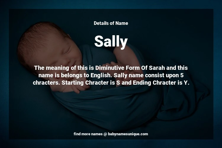 The name Sally is chosen by those who are willing to find Unique Transgenders Baby Names. The meaning of this is Diminutive Form Of Sarah and this name is belongs to English Origin. Baby Name Sally consist upon 5 chracters. Starting alphabet is S and ending alphabet is Y. This name is used primarily by parents who are considering unique baby names for Transgenders. The Zodiac Sign suitbale for this name are;
