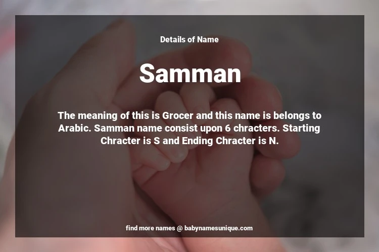 The name Samman is chosen by those who are willing to find Unique Boy Baby Names. The meaning of this is Grocer and this name is belongs to Arabic Origin. Baby Name Samman consist upon 6 chracters. Starting alphabet is S and ending alphabet is N. This name is used primarily by parents who are considering unique baby names for Boy. The Zodiac Sign suitbale for this name are;