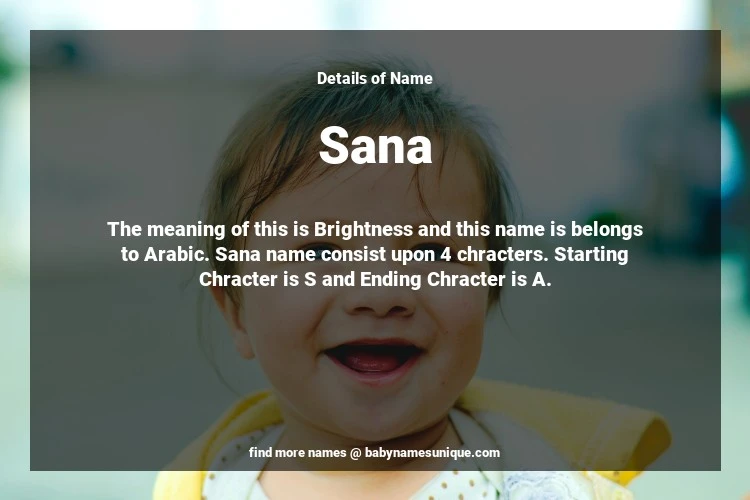 The name Sana is chosen by those who are willing to find Unique Transgenders Baby Names. The meaning of this is Brightness and this name is belongs to Arabic Origin. Baby Name Sana consist upon 4 chracters. Starting alphabet is S and ending alphabet is A. This name is used primarily by parents who are considering unique baby names for Transgenders. The Zodiac Sign suitbale for this name are;