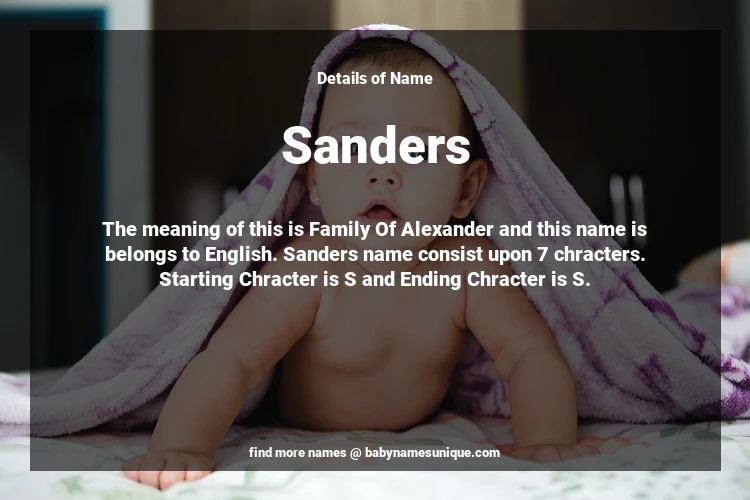 The name Sanders is chosen by those who are willing to find Unique Boy Baby Names. The meaning of this is Family Of Alexander and this name is belongs to English Origin. Baby Name Sanders consist upon 7 chracters. Starting alphabet is S and ending alphabet is S. This name is used primarily by parents who are considering unique baby names for Boy. The Zodiac Sign suitbale for this name are;