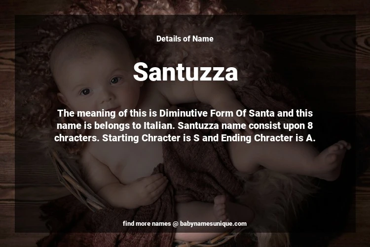 The name Santuzza is chosen by those who are willing to find Unique Transgenders Baby Names. The meaning of this is Diminutive Form Of Santa and this name is belongs to Italian Origin. Baby Name Santuzza consist upon 8 chracters. Starting alphabet is S and ending alphabet is A. This name is used primarily by parents who are considering unique baby names for Transgenders. The Zodiac Sign suitbale for this name are;