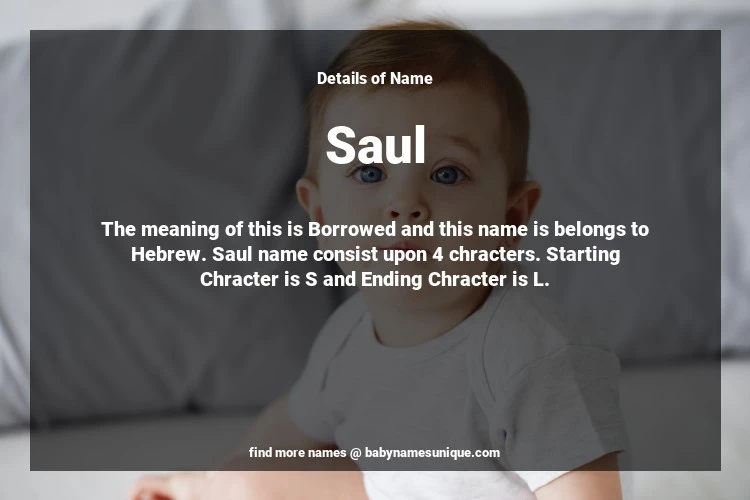 The name Saul is chosen by those who are willing to find Unique Boy Baby Names. The meaning of this is Borrowed and this name is belongs to Hebrew Origin. Baby Name Saul consist upon 4 chracters. Starting alphabet is S and ending alphabet is L. This name is used primarily by parents who are considering unique baby names for Boy. The Zodiac Sign suitbale for this name are;