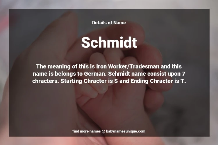 The name Schmidt is chosen by those who are willing to find Unique Boy Baby Names. The meaning of this is Iron Worker/Tradesman and this name is belongs to German Origin. Baby Name Schmidt consist upon 7 chracters. Starting alphabet is S and ending alphabet is T. This name is used primarily by parents who are considering unique baby names for Boy. The Zodiac Sign suitbale for this name are;
